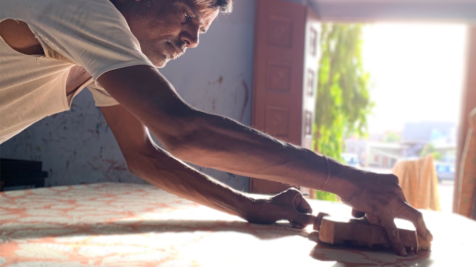 一塊木頭,雕刻成精緻的蓋印章,再到蓋印美麗精細的布匹,一切純手工完成。獨特的工匠藝術,賦予了手蓋印織物獨特且溫暖的魅力。